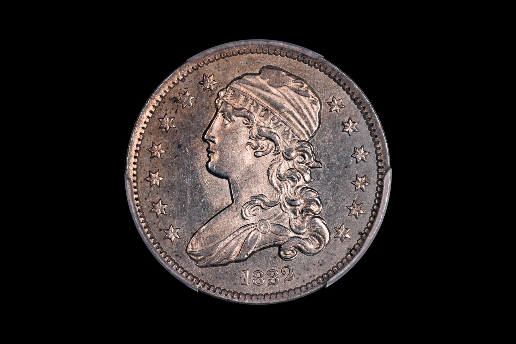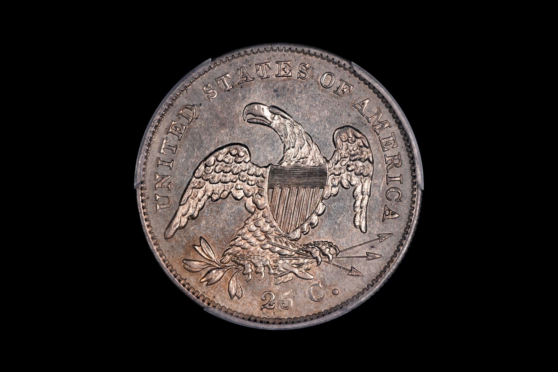 Brilliant luster and slightly reflective fields define this Bust quarter dollar, and central die polish provides contrast between devices and fields. Subtle toning is present on both obverse and reverse, but there are no distracting spots. Light hairlines are noted due to the reflective qualities of the fields, but the coin is original and pleasing to the eye.