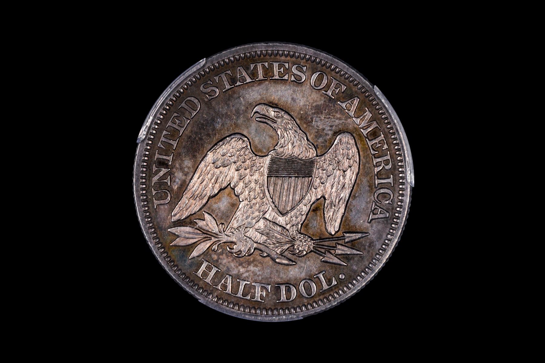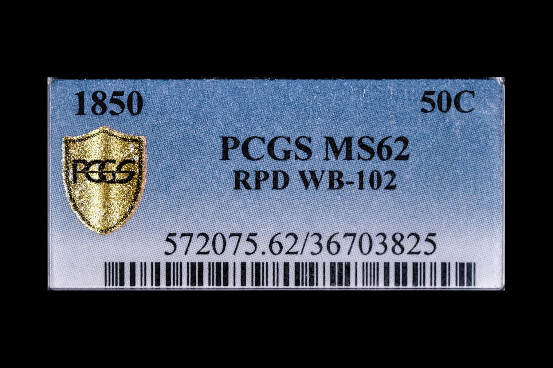 A beautiful specimen and sole top pop (at time of writing) for the 1850 half dollar re-punched date WB-1, this coin is graded a mere Mint State 62. Pastel tones cover the obverse, and brighter greens and blues adorn the reverse of the coin. Some weakness of strike is noted on the eagle’s talons, but periphery is strong. A few ticks can be noted in the field adjacent to Miss Liberty’s outstretched hand, but nothing is distracting from the overall quality of the coin.