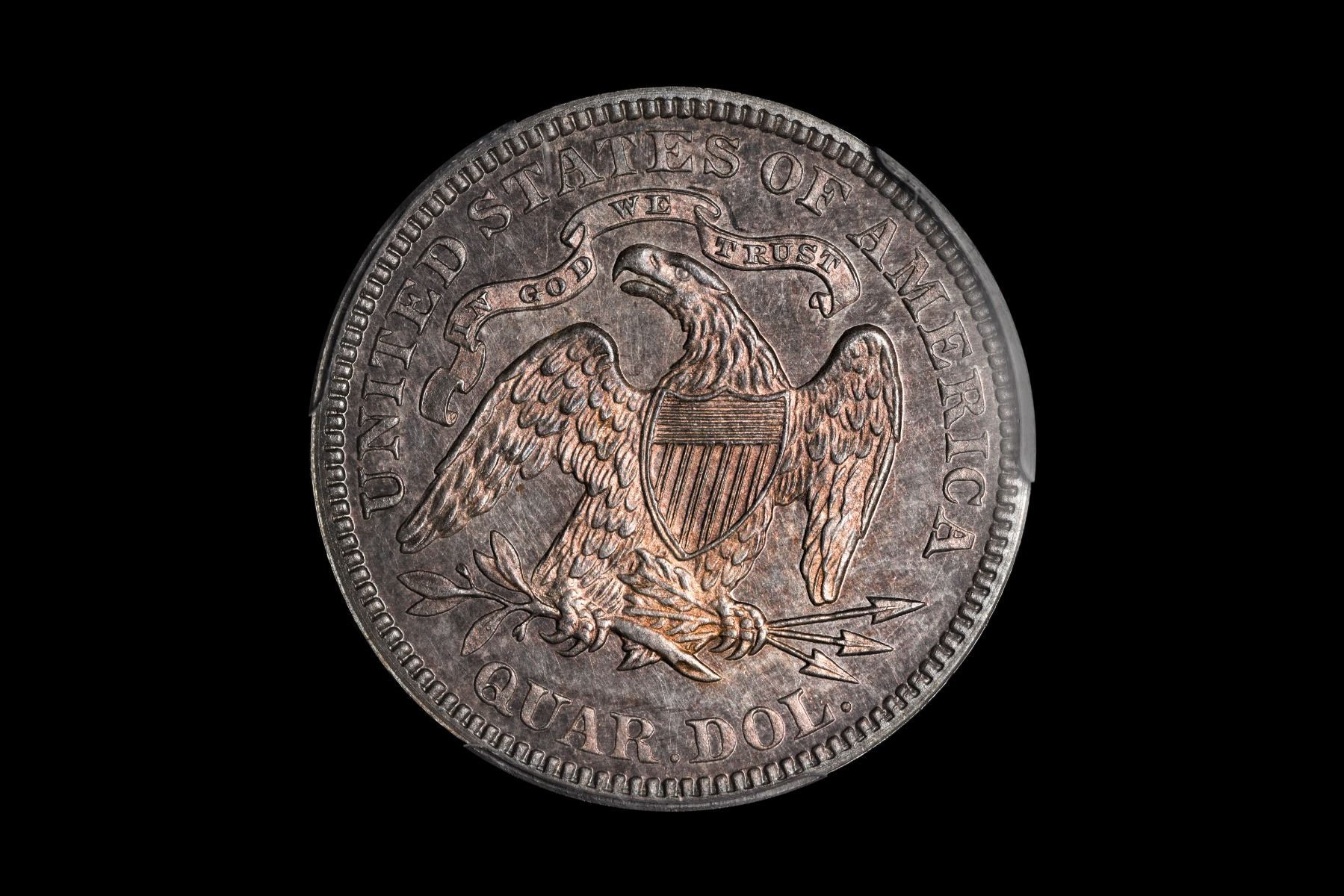 True cameo on the devices and beautiful orange blossom toning grace the fields of this delightful proof Seated quarter dollar. The 1877 date has multiple examples of cameo quarter dollars, but this is among the nicer pieces that won’t break the bank. There are a couple light spots on the obverse and reverse, but do not detract from the beauty of this specimen. Certified Acceptance Corp. has seen and approved of the grade. From the Centennial Collection.