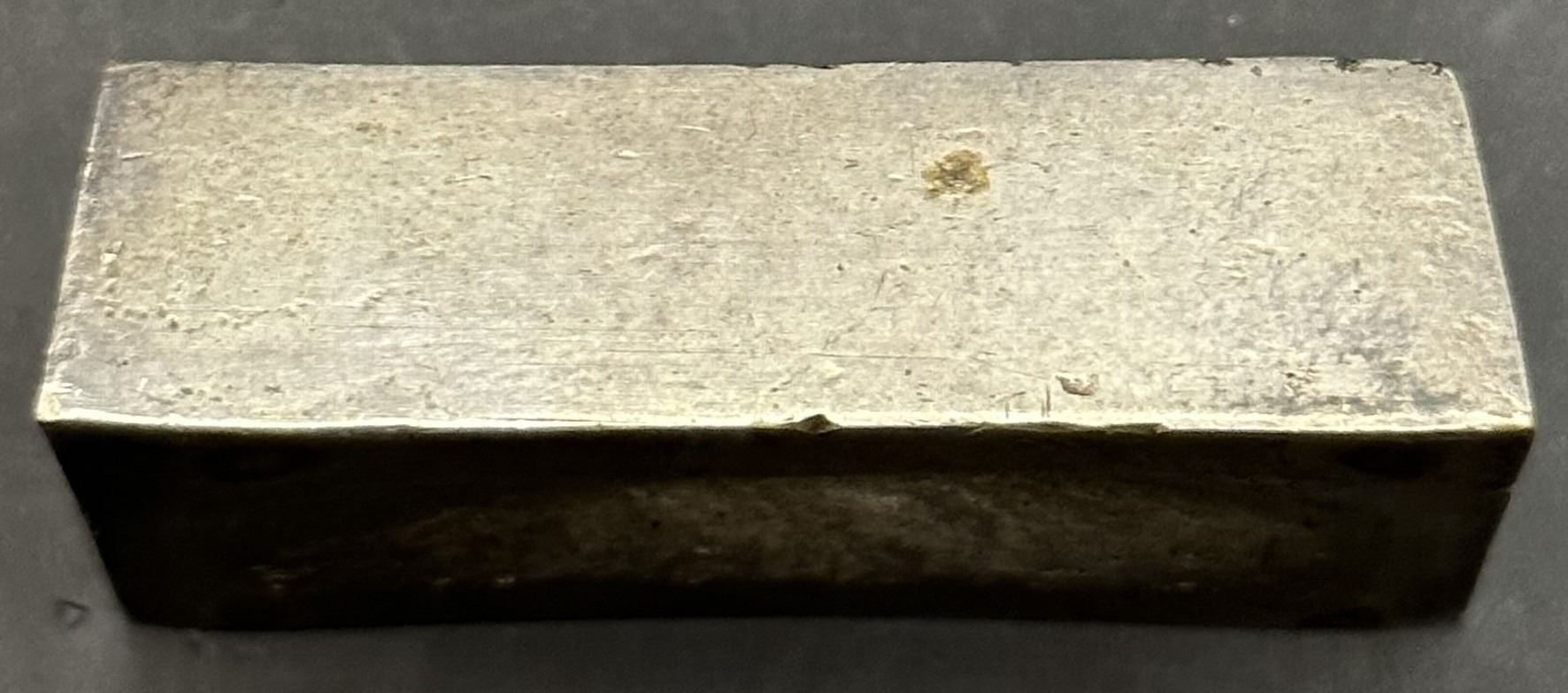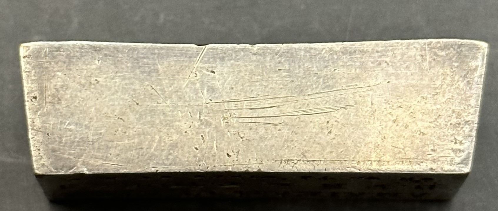 This unique mixed metal ingot is an advertisement piece from San Francisco Novelty, Gold, Silver, & Nickel Plating Works. Located at 68, 70 & 72 First Street, San Francisco California. From a 1893 newspaper, “Notice to gold miners! Silver Plated Amalgamated Plates for saving gold! In quartz, gravel, or placer mines. Made of best soft Lake Superior copper at reduced prices. Our prices are guaranteed! Thousands of orders filled. San Francisco Novelty, Gold, Silver, & Nickel Plating Works”. This ingot is nicely toned and in excellent condition for its age.