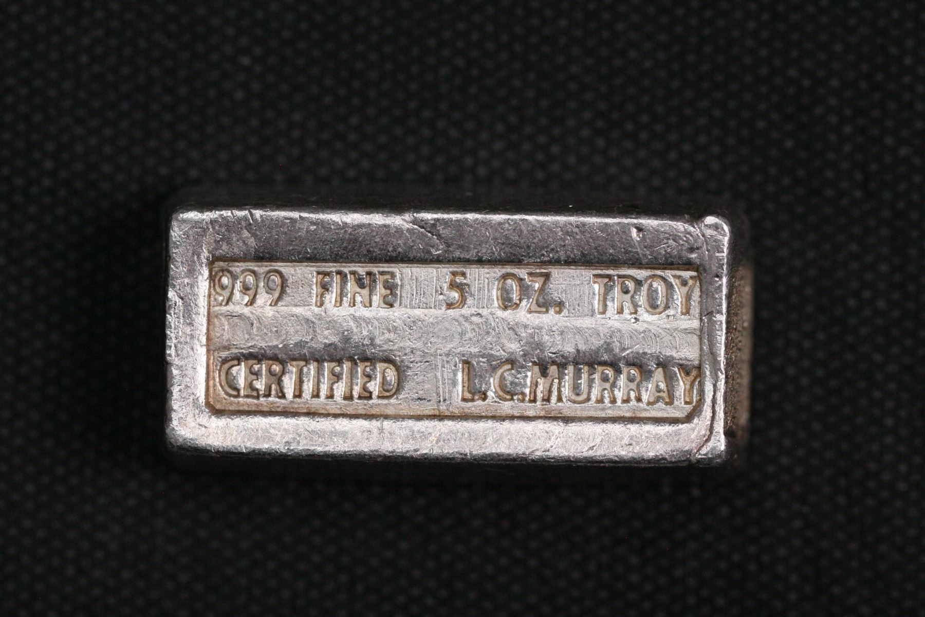 Rare LC Murray 5 oz class ingot featuring the picture frame mold and no torch logo. Instead this bar is struck with full name of the refiner. Often seen with a “LCM” inside of a flame torch.