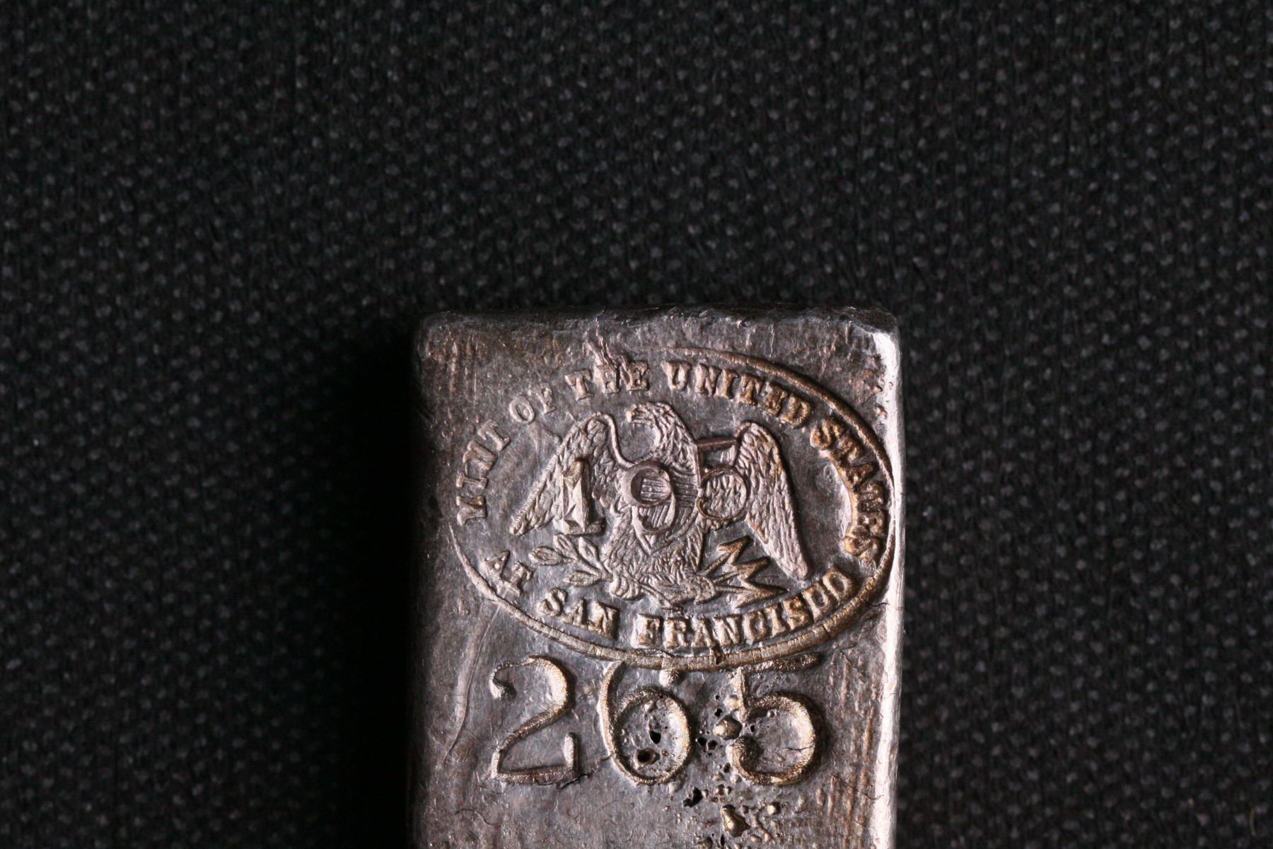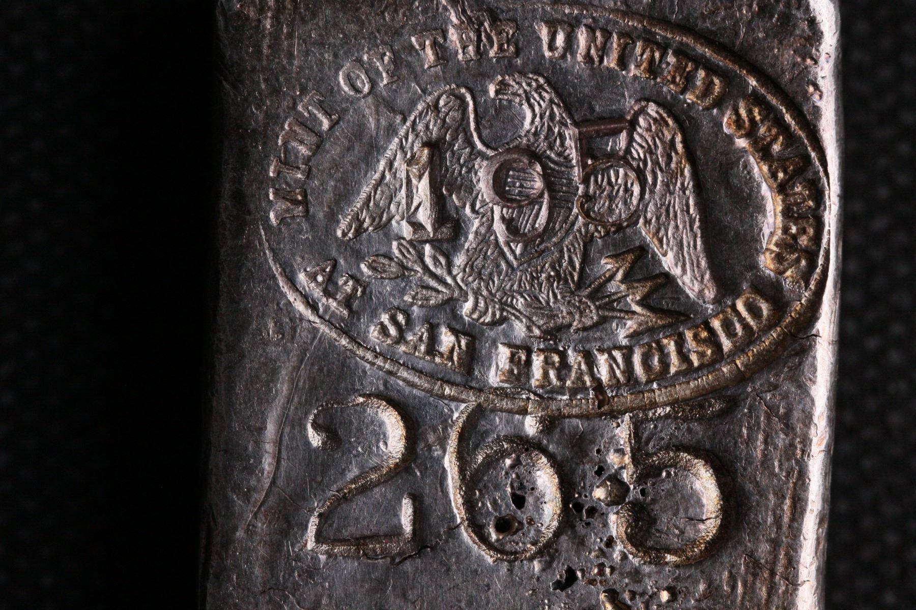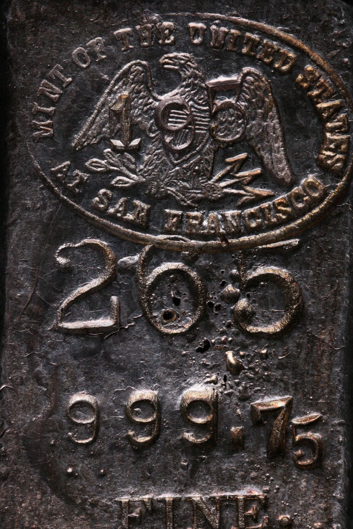 San Francisco Mint Silver Ingot, 5.14 Ounces Type One Oval Hallmark with Overpunched Logo. 195/265 serial. Super Rare Mint Bar! The secondary number #195 appears on only a handful of ingots in this series in the numerical range of #216 to #265. According to Ken Conway, ingot collector and main authority for Mint Bars, only 4 examples are known to exist.