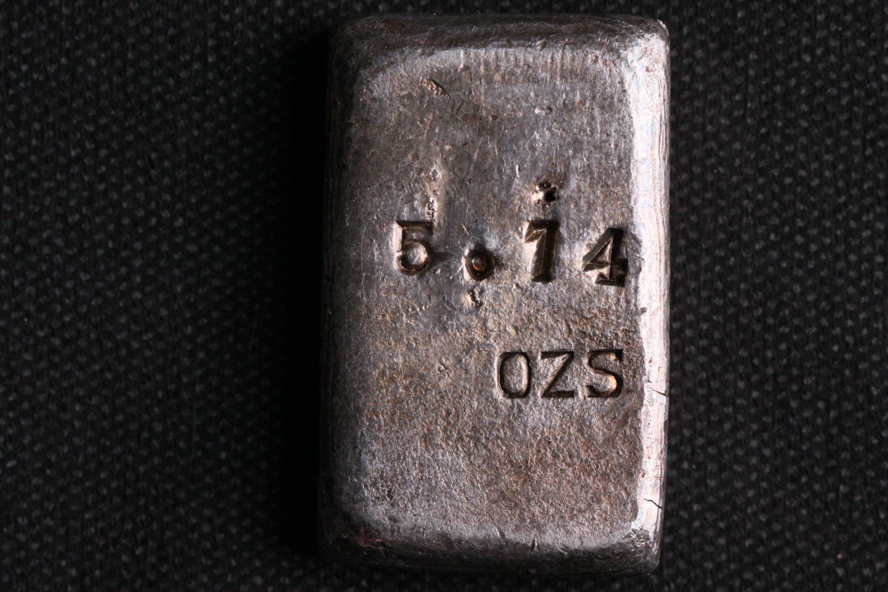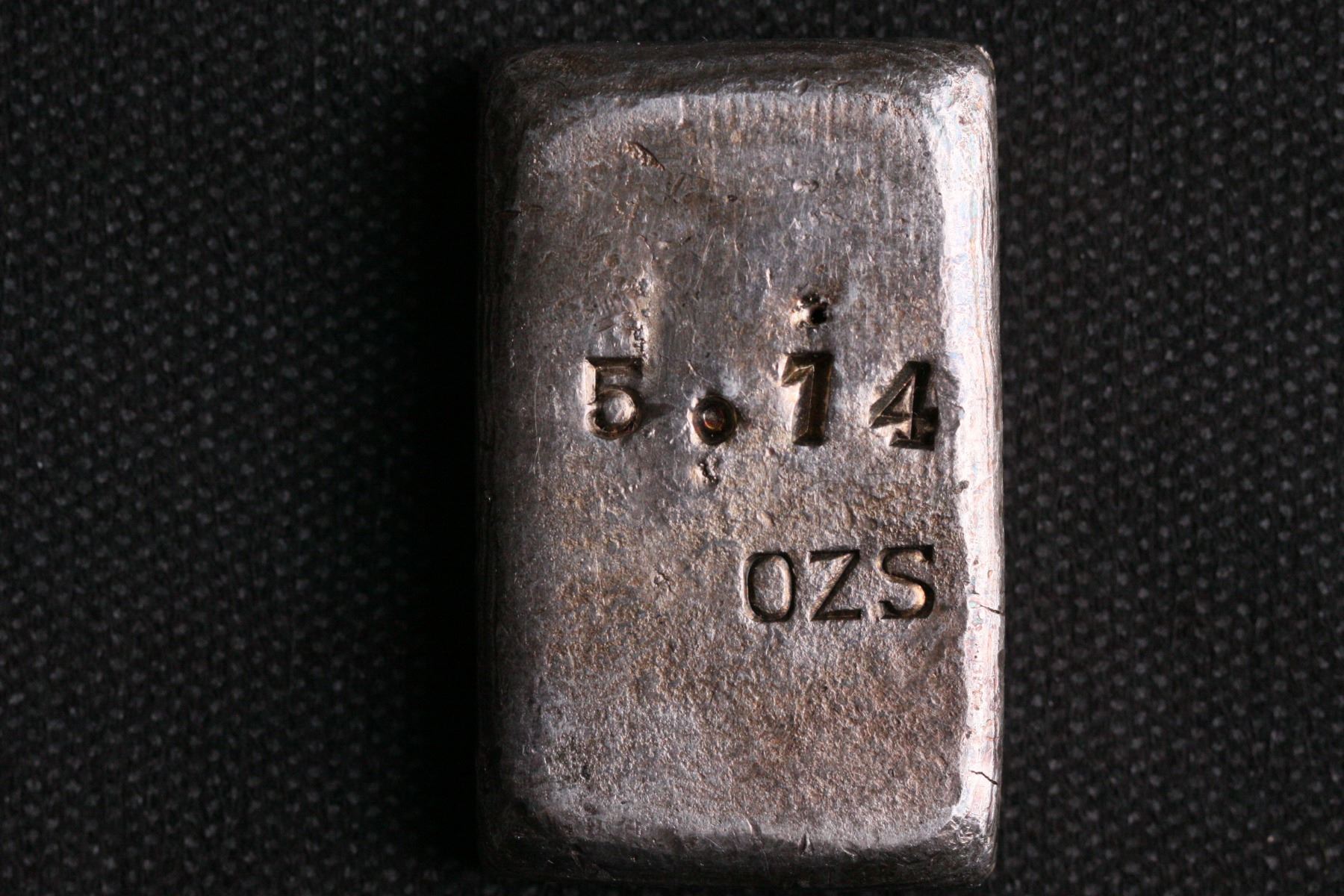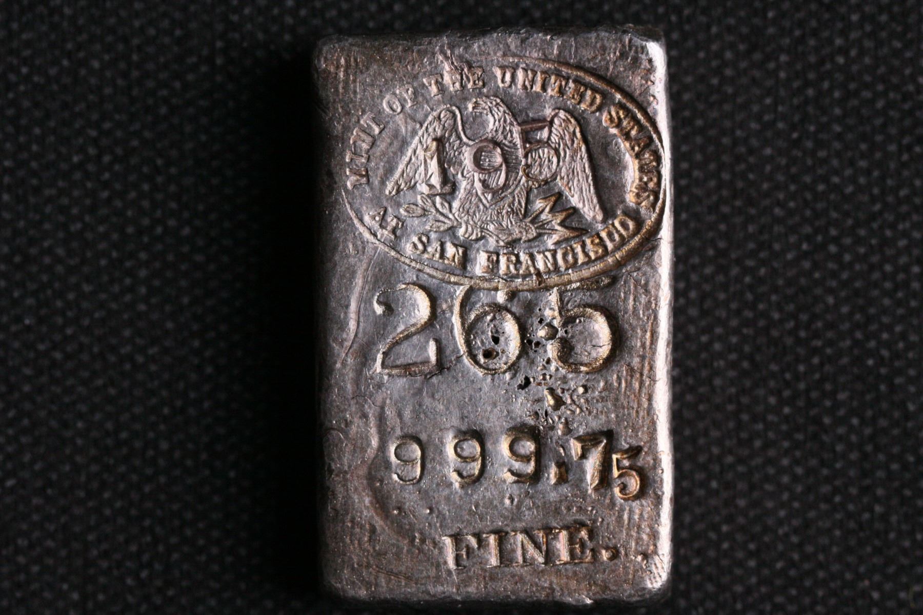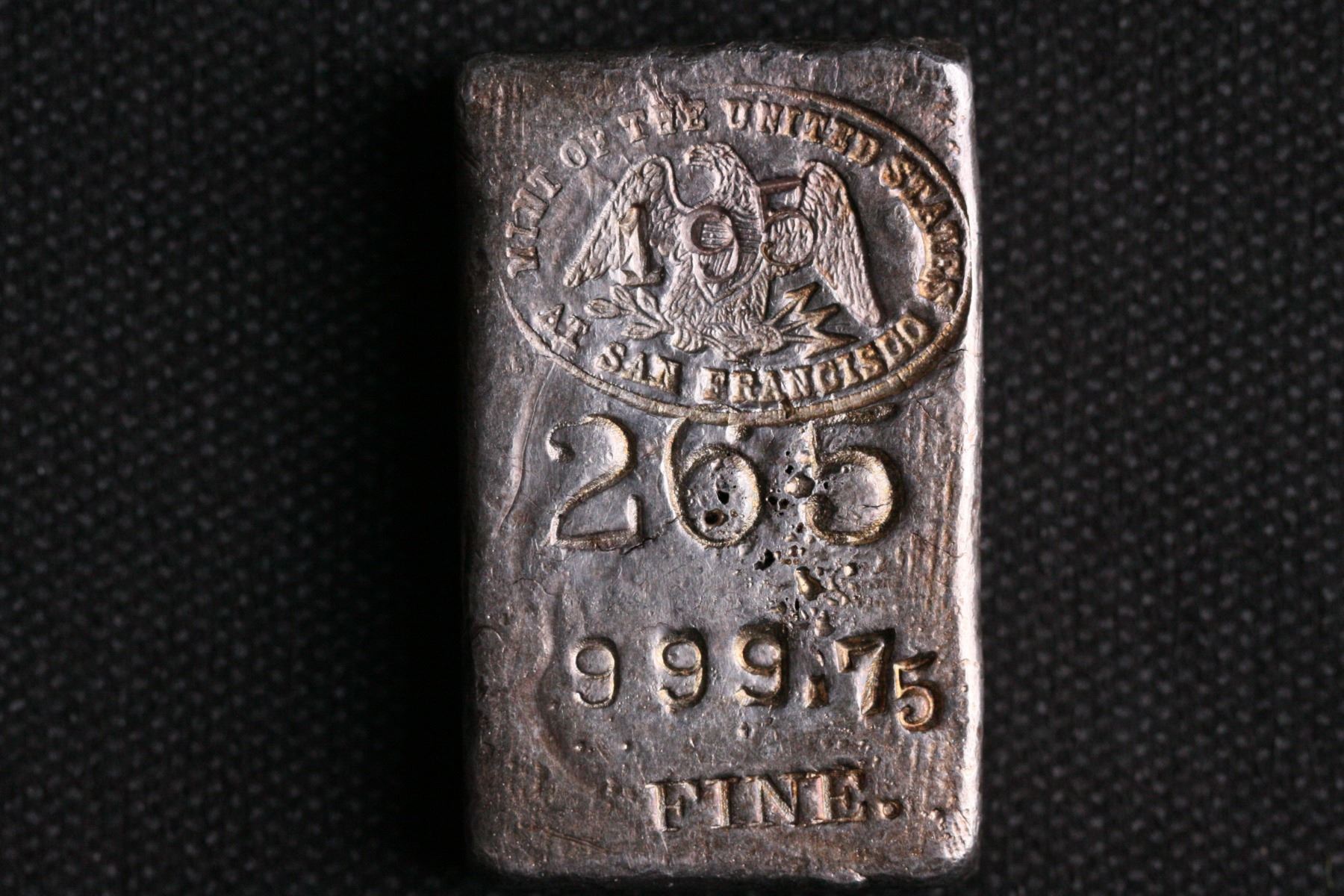 San Francisco Mint Silver Ingot, 5.14 Ounces Type One Oval Hallmark with Overpunched Logo. 195/265 serial. Super Rare Mint Bar! The secondary number #195 appears on only a handful of ingots in this series in the numerical range of #216 to #265. According to Ken Conway, ingot collector and main authority for Mint Bars, only 4 examples are known to exist.