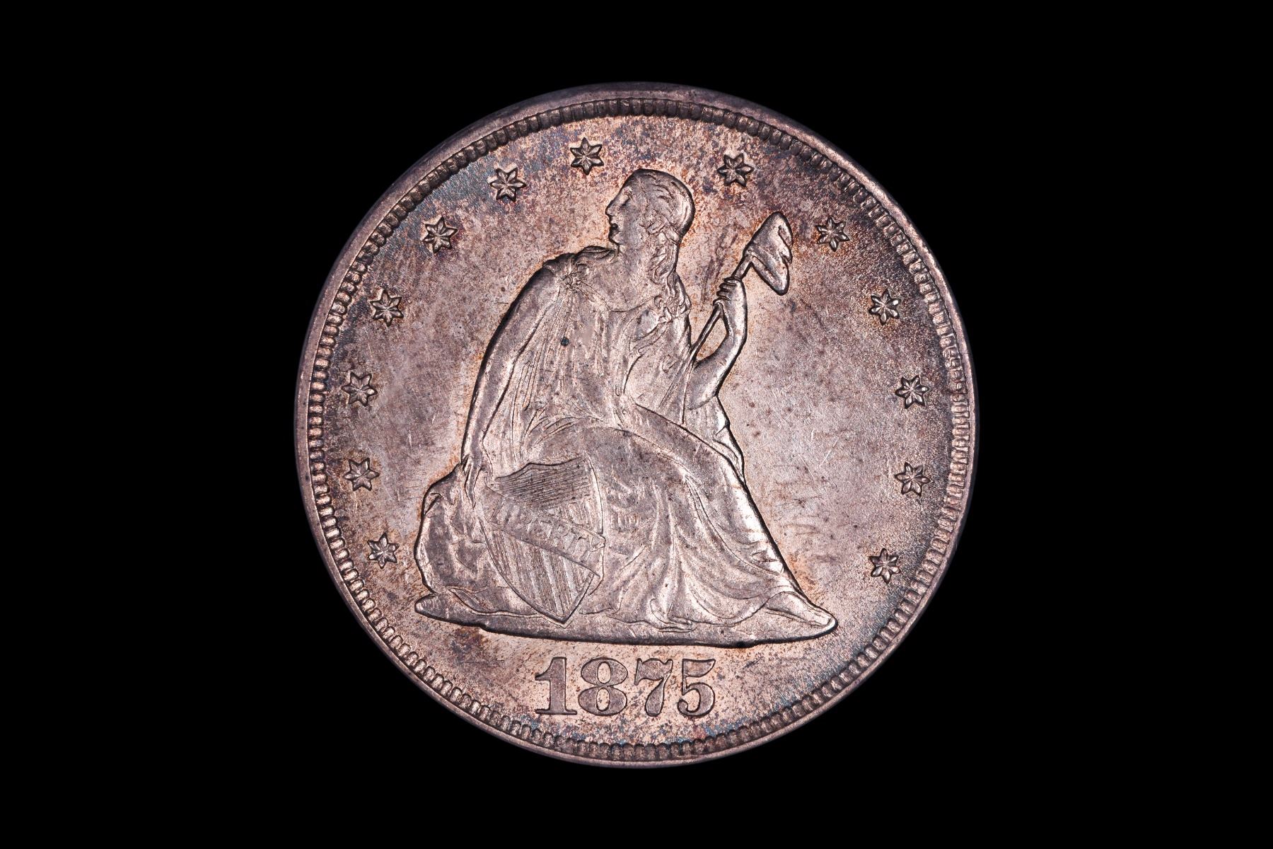 Los campos delicados y los tonos rojizos ponen a subasta esta increíble pieza de veinte centavos de Carson City para un coleccionista avanzado. Se puede ver un brillo total debajo del tono y no hay marcas de bolsas ni manchas importantes. La 1875-CC es conocida por un golpe inferior al promedio debido a la débil presión del troquel, y esta moneda lo resume sin perder atractivo visual.