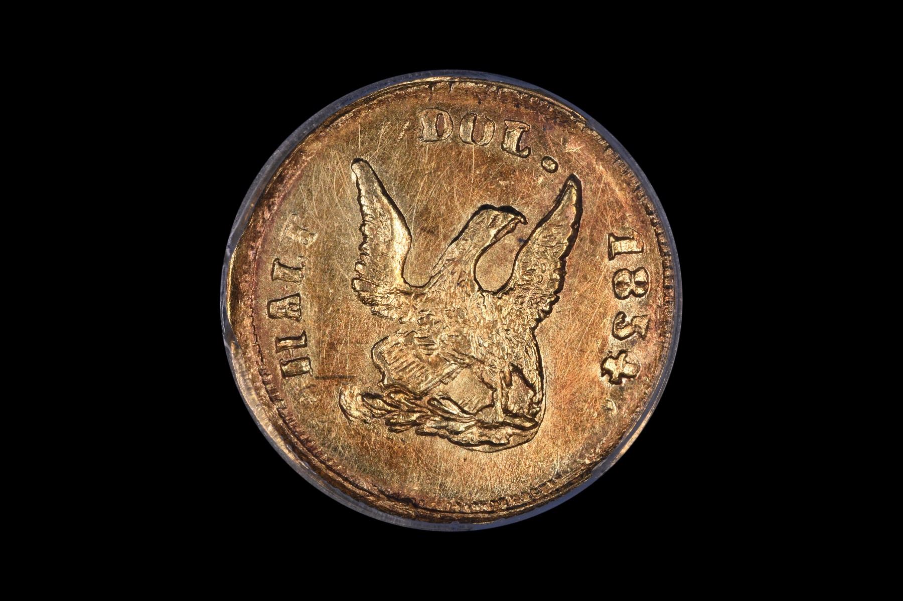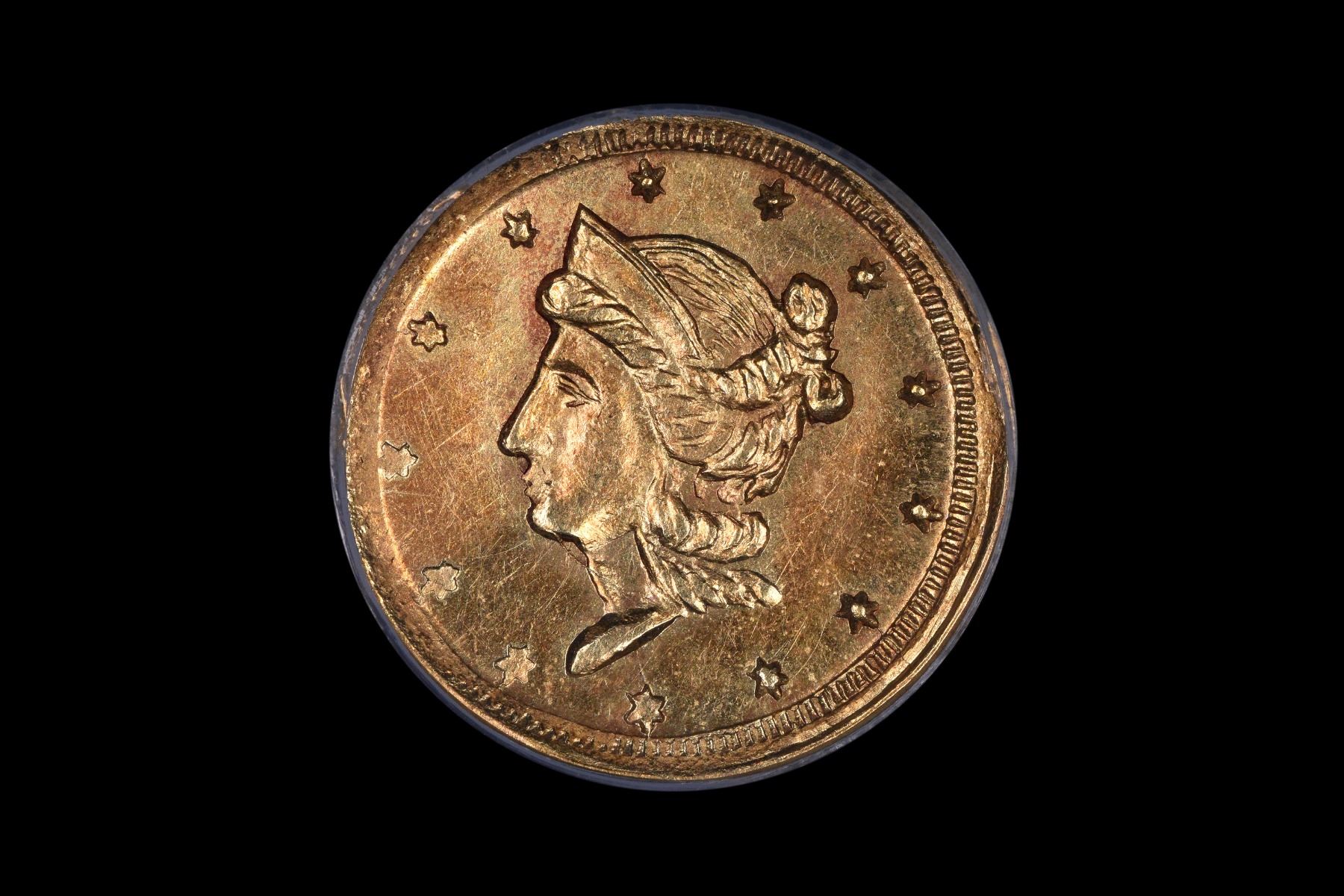 An interesting specimen, and only five coins in higher grades certified at PCGS at the time of writing. This coin features light orange/russet toning throughout both obverse and reverse with bright gold luster underlying. A very pleasing example in hand, this appears to be net graded for the light hairlines on the upper portion of the reverse. Well struck, with slight weakness toward 4 o’clock on the obverse. This is a choice specimen for the specialist collector.