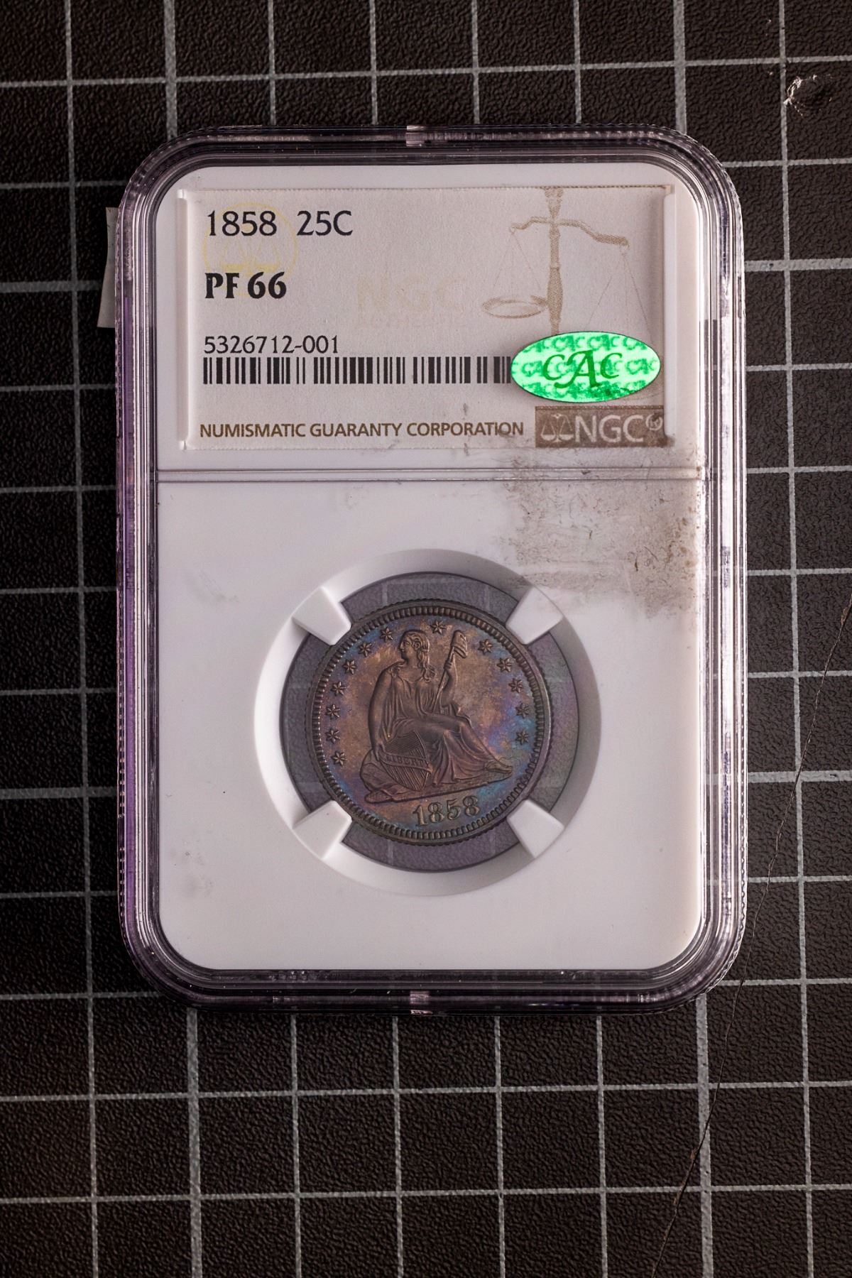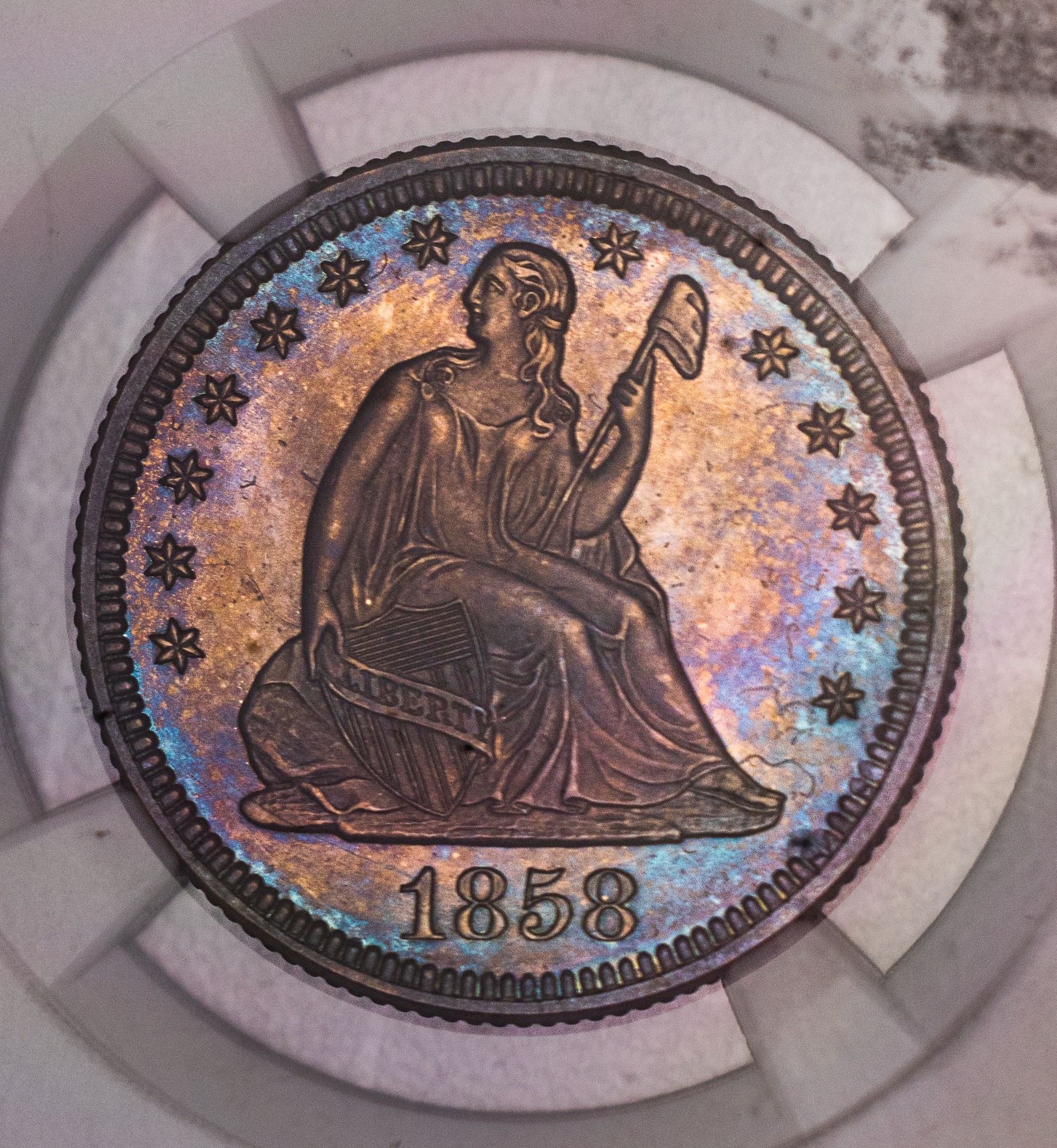 Wonderful, near flawless proof featuring electric blue and hints of red throughout the obverse and reverse. This coin features a very sharp strike and a glossy proof finish. With an estimated original mintage of 100 only 80 are estimated to have survived in all grades. This coin is also CAC endorsed. These were some of the first proof coins ever to be sold to the coin collecting public, but these coins are very underrated.