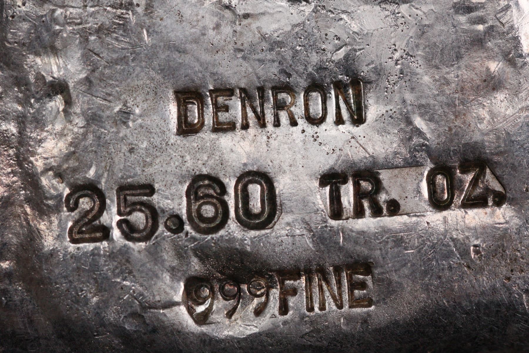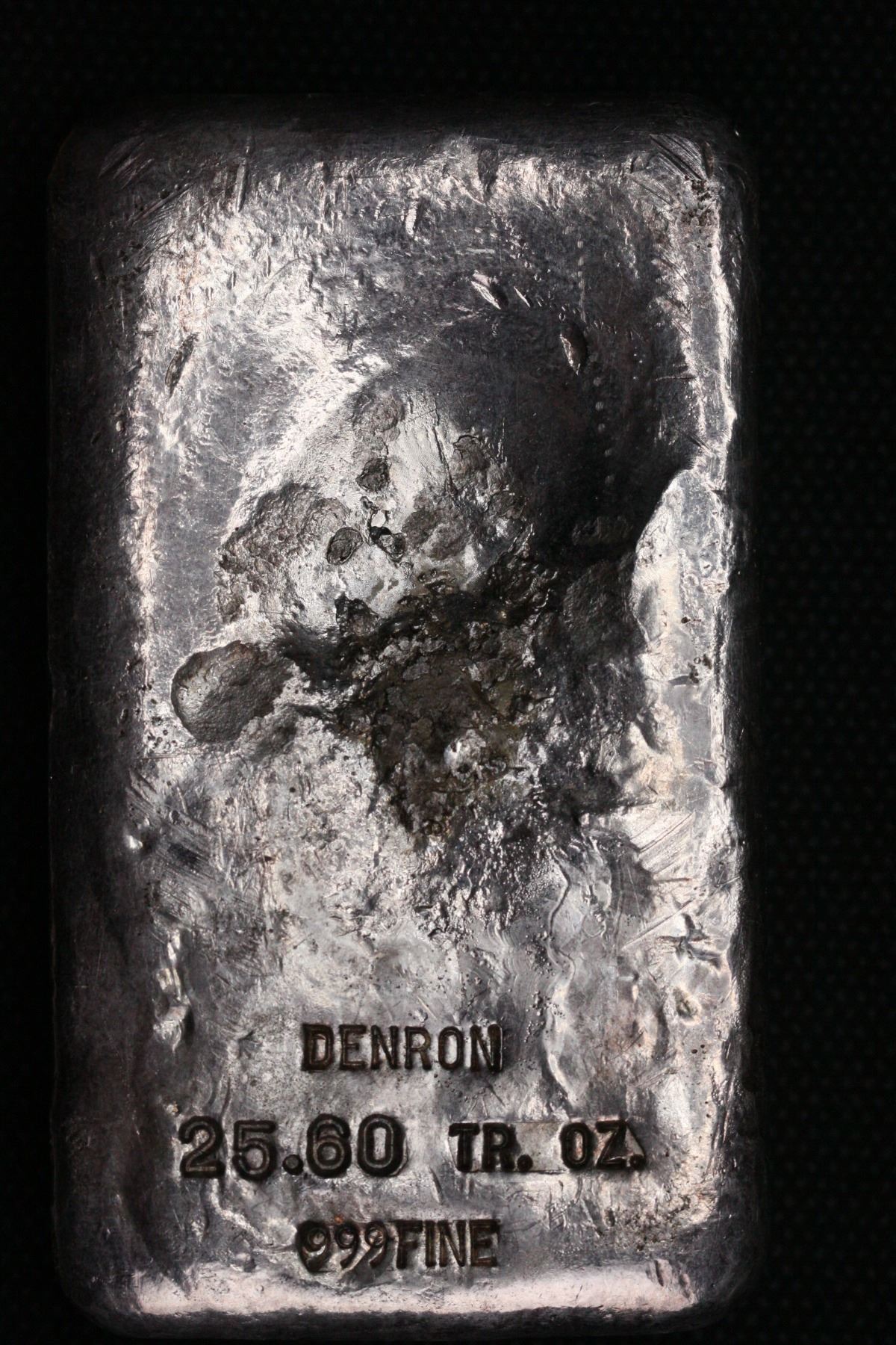 Denron Ltd. 是一家位於威斯康辛州橡樹溪的小型金屬公司。許多公司會與煉油廠簽訂合同,為其生產鋼錠。該錠大概是 1970 年代或更早由科羅拉多州 Cripple Creek 精煉廠生產的。克里普爾溪礦區位於科羅拉多州特勒縣,是採礦界的知名礦區。該模具(3.43 英寸 x 1.97 英寸)與唯一已知的 20 盎司級 Cripple Creek Colorado 錠直接匹配。重量和細度印記的字體也直接匹配。此錠僅鑄造“Denron”。這個重量級只有兩個已知的例子,這使得它成為一個極其難以獲得的桿。