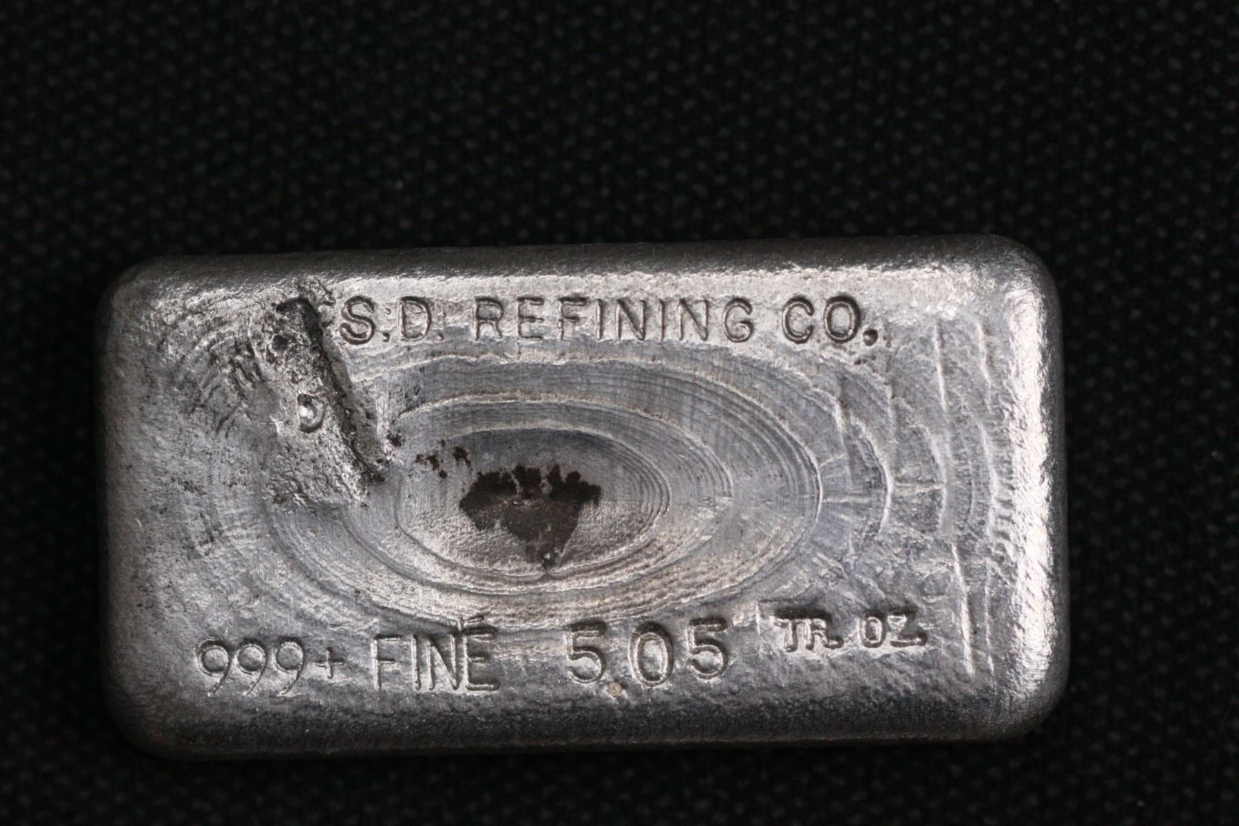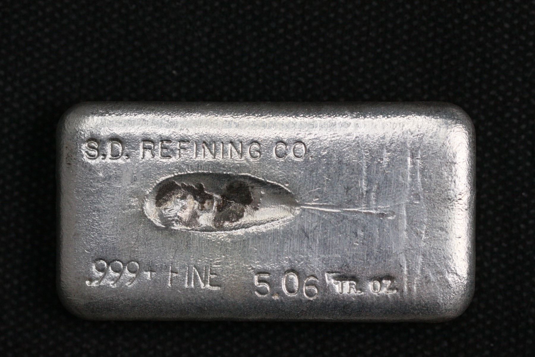 SD Refining 生產的 5 盎司級金錠對於這家精煉廠來說極為罕見,是他們生產的最低發行量的金塊。 SDR 生產的錠尺寸為 5-50 盎司。最常見的是 10 盎司品種,但為婚禮專門生產了一批 120 - 5 盎司的金錠。這些被作為禮物分發給與會者。 SDR 是一家非常受歡迎的加州煉油廠,於 1970 年代開業。此範例在澆注頂部刻有公司名稱,並在澆注底部刻有著名的鑽石刻度徽標。獨特的相框式模具深受收藏家的歡迎。